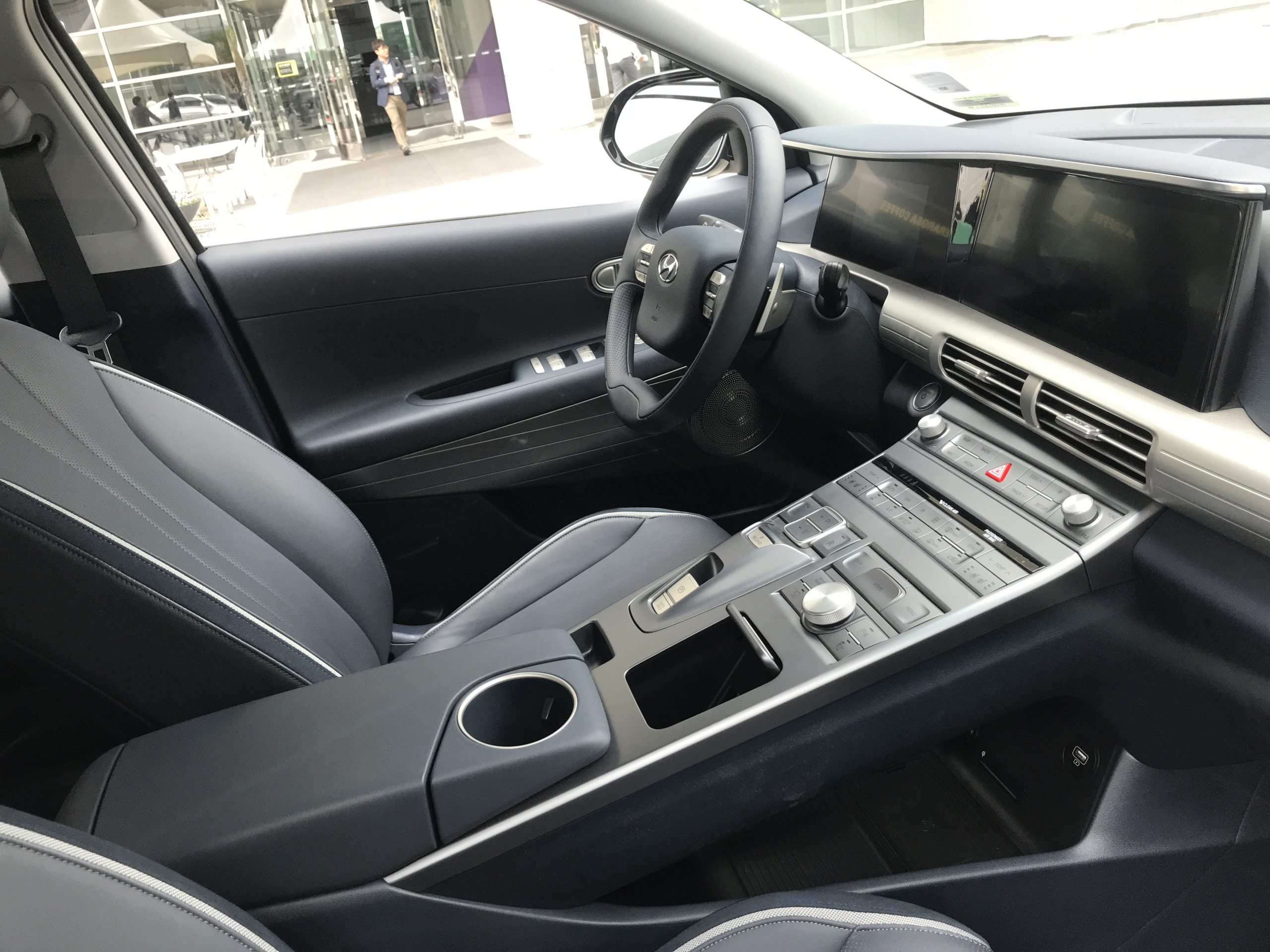 팰리세이드의 운전석에 앉으며 생각나는 것이 작년에 잠시 시승한 수소연료전지차 “넥쏘”의 실내였습니다. 기어봉없이 스위치로 기어를 조작하는 방식이나 센터콘솔이 우뚝 솟은듯한 모습은 비슷한 느낌을 전달합니다.
