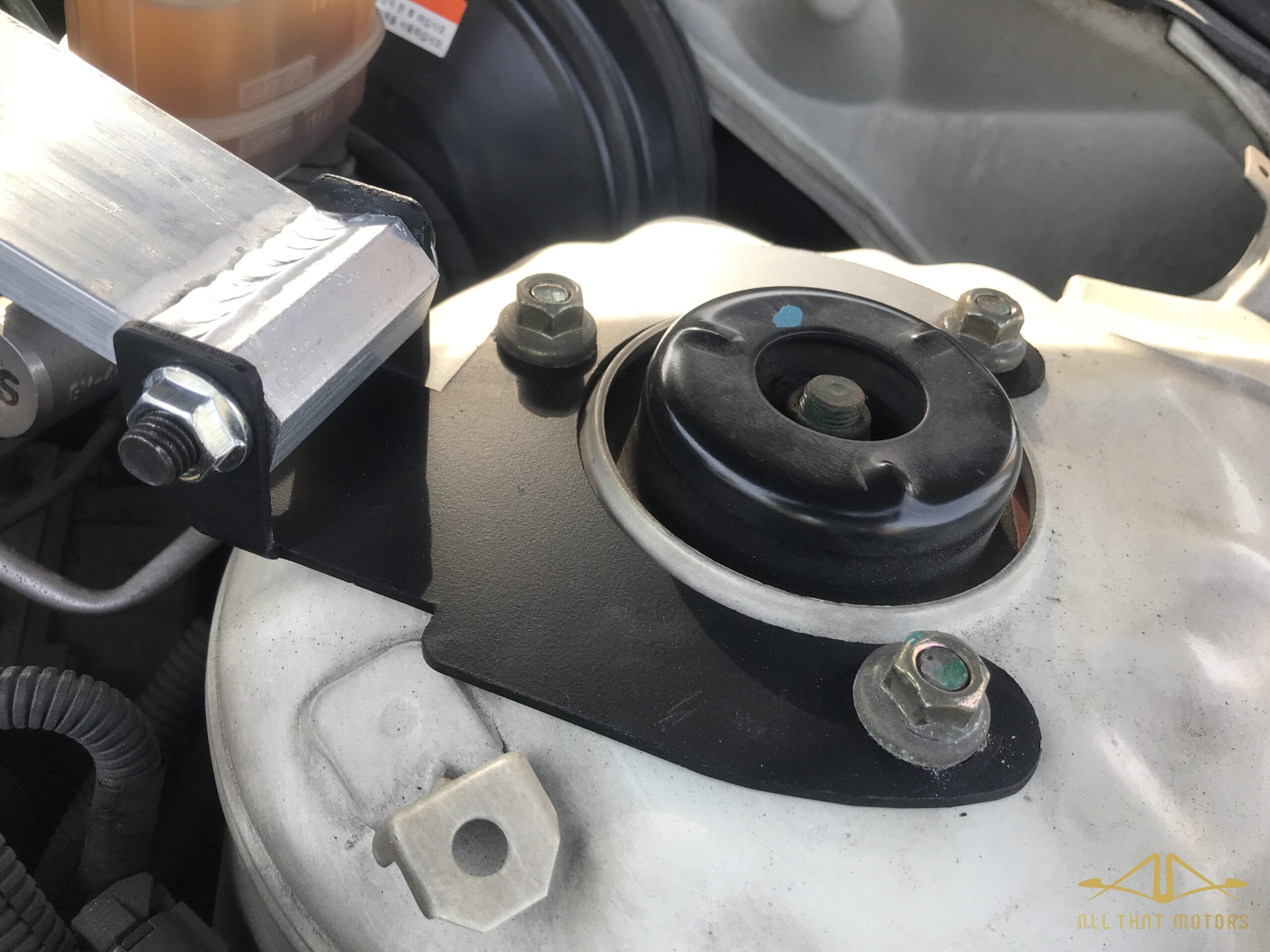브라켓의 위치를 잡고 마운트의 나사를 조금만 조여 놓고 브라켓과 스트럿바를 먼저 단단히 고정시킨다. 그런 다음 브라켓과 쇽업 마운트를 원래대로 단단히 고정시킨다.