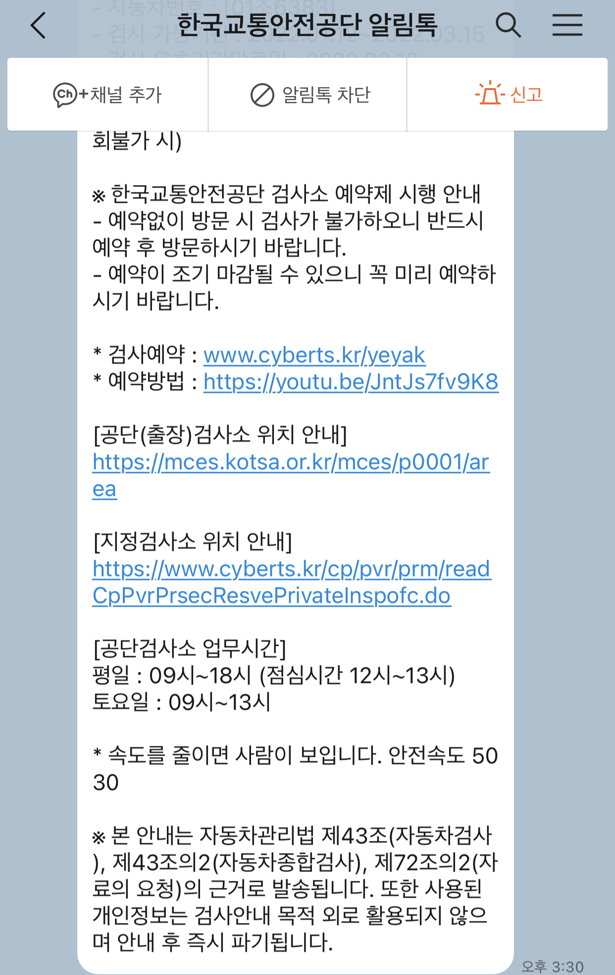 요즘은 카카오톡 SNS 통해 차주에게 자동차정기(종합) 검사와 관련된 내용을 미리 알려주고 있다.