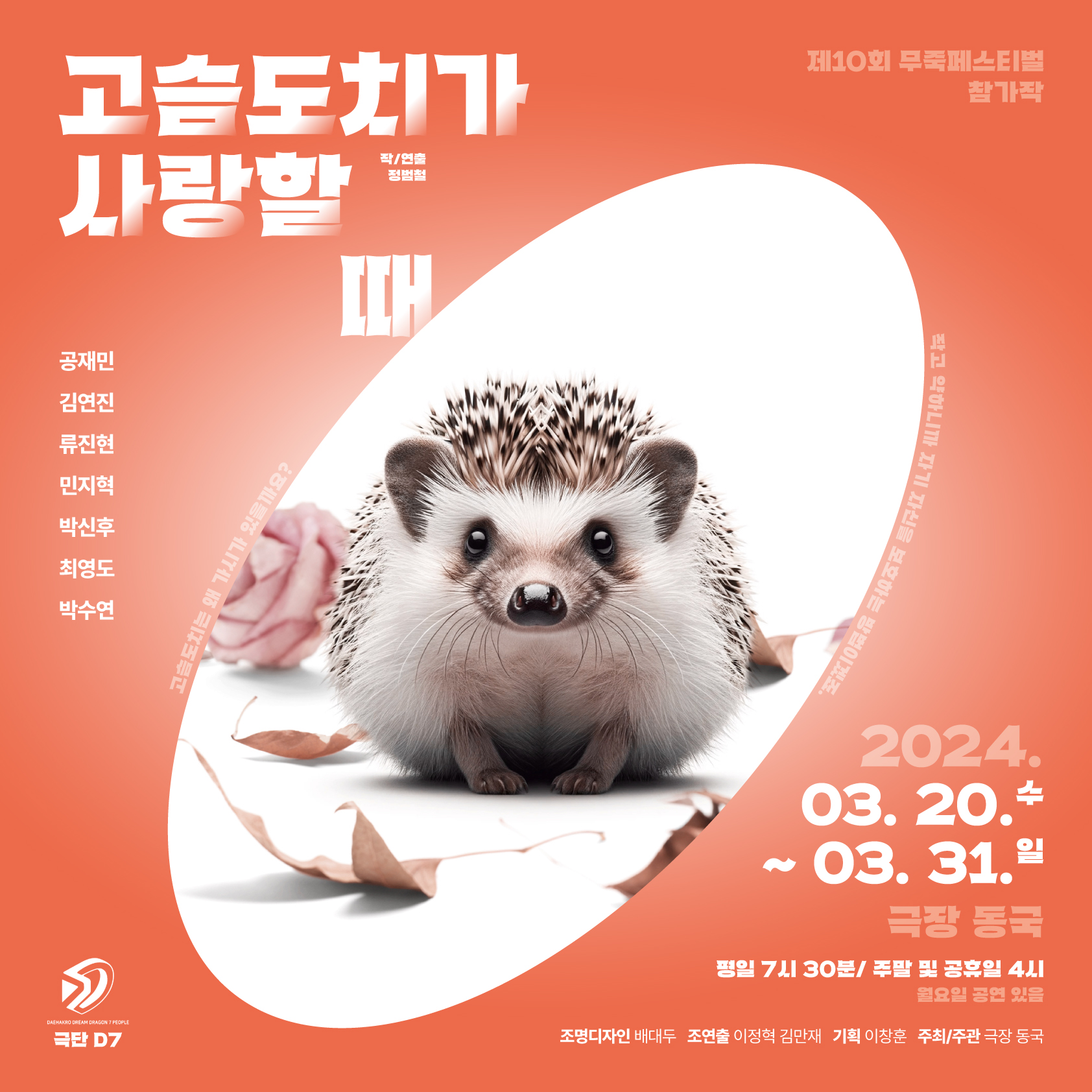 극단 D7 이번 『고슴도치가 사랑할 때』는 연일 많은 관객들의 호응과 응원 속에 공연이 펼쳐지고 있으며 앞으로 있을 업그레이드가 예고된 연극 『감노슈가(감마선에 노출되어 슈퍼 히어로가 세명의 박사는 지구를 지키려 하지 않는가?)』에 깊은 관심과 기대를 가지게 만든다.